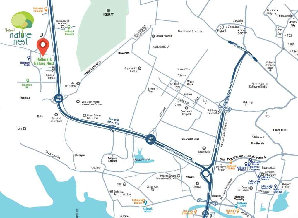 Hallmark Nature’s Nest by Hallmark Builders is an expansive residential project located in Kollur, Hyderabad. Spread across 45 acres, this under-construction development offers a premium living experience amidst serene surroundings. The project features a total of 447 well-planned units, catering to families looking for spacious and thoughtfully designed homes. With configurations of 3 and 4 BHK, the project is ideal for those seeking comfort, privacy, and a balanced lifestyle away from the city’s hustle.