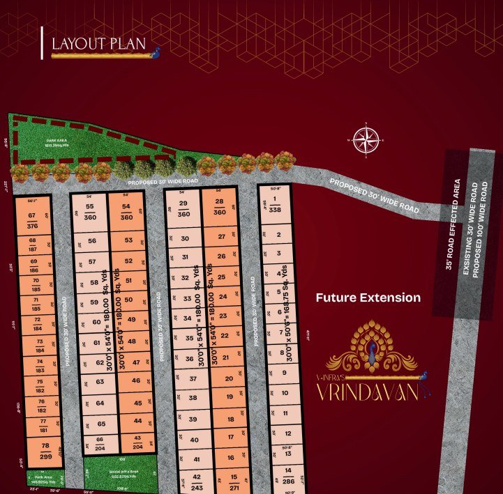 Vrindavan – The Harmony Enclave by V Infra & Developers is an HMDA-approved and RERA-certified gated community offering premium residential plots for sale in Shadnagar, Hyderabad. Sprawled across 15 acres, the project features 78 thoughtfully planned plots ranging from 165 Sq. Yds to 720 Sq. Yds, making it ideal for both investment and future home construction. Strategically located facing the Bangalore Highway and within the proposed Regional Ring Road, Vrindavan ensures excellent connectivity to the International Airport and key corporate hubs such as Microsoft, P&G, and Johnson & Johnson.